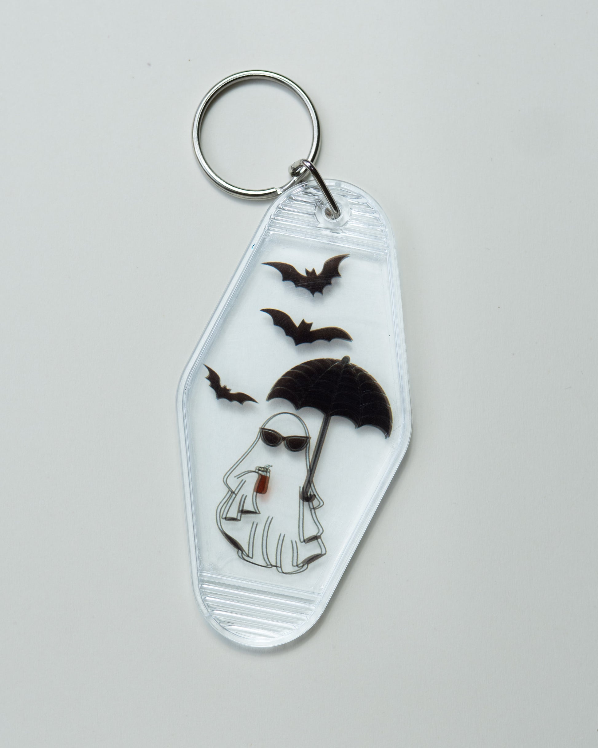 Our handmade gothic ghost design from our summer collection on two options- clear, or white keychain.