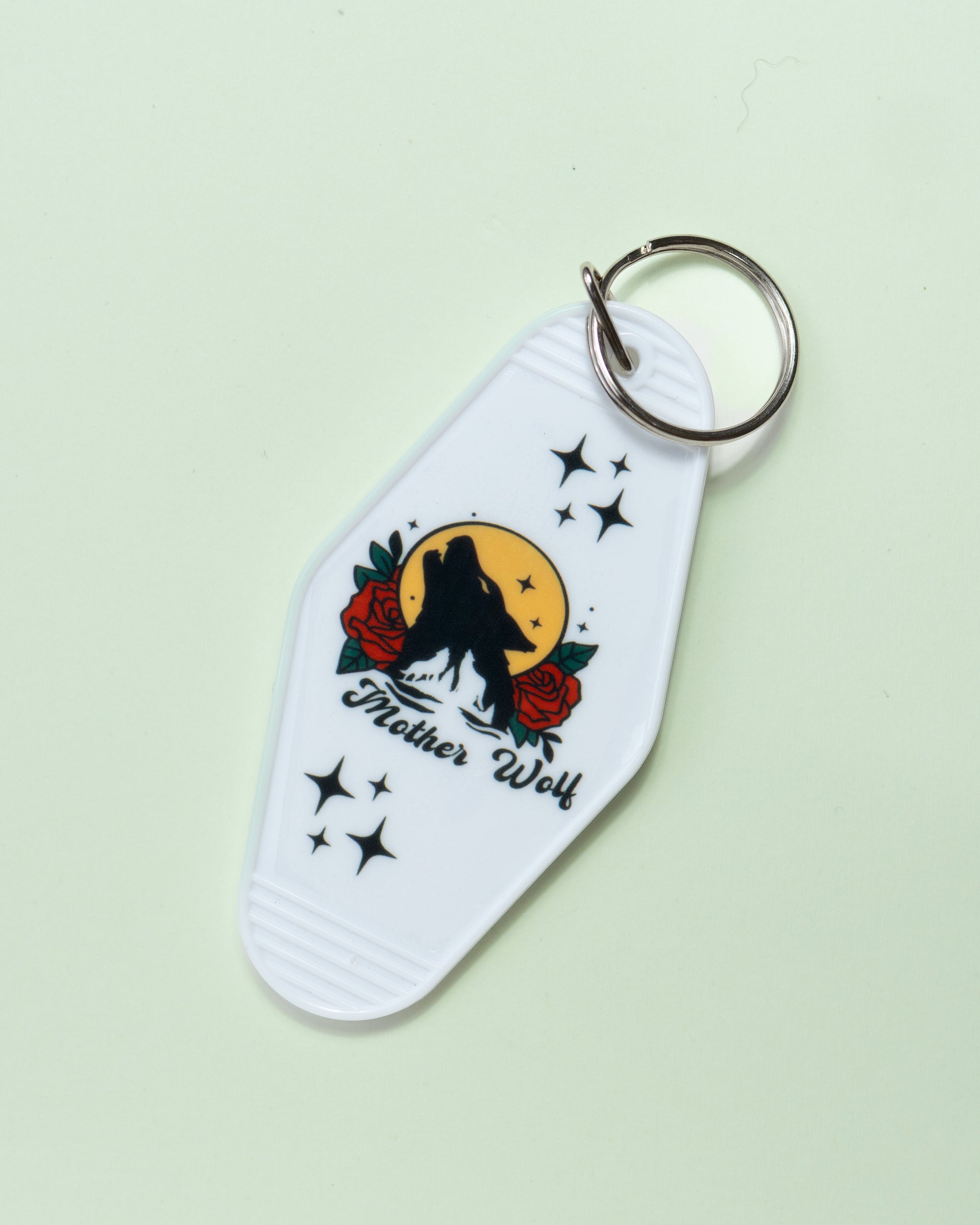 Our original Mother Wolf design on two options- clear, or white keychain.